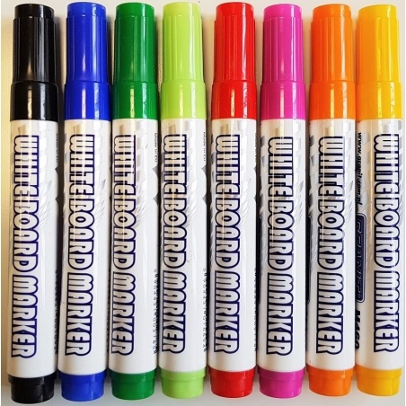 Zestaw markerów do tablic białych suchościeralnych składa się z 8 kolorów: czarny, niebieski, zielony, czerwony, oranż, żółty, seledyn oraz purpurowy.